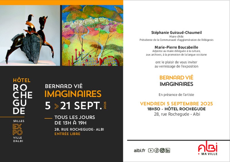 Le peintre, sculpteur et architecte, Bernard Vié, expose ses œuvres graphiques et plastiques à l’Hôtel Rochegude d’Albi, 28 rue Rochegude. L’exposition a lieu du 5 au 21 septembre. Entrée libre. Vernissage le 5 septembre 18h30 à l’Hôtel Rochegude !