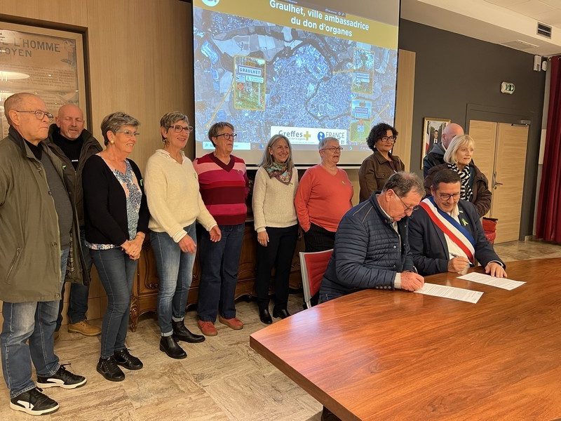 Le vendredi 21 novembre, l’ADOT 81 et son président André Veyssière étaient reçus en mairie, salle de la République pour la cérémonie d’Inauguration « Ville Ambassadrice du don d’Organes » afin de signer la Charte portée par France ADOT 81. Blaise Aznar soulignait la démarche entérinée par la municipalité et saluait le don d’organes comme geste de solidarité : « 10 000 patients sont en attente ; 1 seul donneur peut sauver jusqu’à 7 vies. » André Veyssière prenait la parole en félicitant la commune de Graulhet pour son engagement en faveur du don d’organes : « Depuis la loi de 1976, chacun est présumé donneur sauf en cas de refus explicite par le donneur de son vivant. La réalité est tout autre puisque 36 % des familles refusent le prélèvement de leur défunt faute d’en parler, alors que 80 % de la population est pour le don d’organes. Paradoxe français. Par la pose des panneaux et la signature de la charte, la municipalité s’engage à diffuser des informations auprès des graulhétois par le biais du magazine municipal, des réseaux sociaux. A cet effet, France Adot 81 s’engage à fournir régulièrement des supports de communication et autres documents sur le don d’organes afin de pérenniser ce partenariat. Merci à tous les bénévoles qui oeuvrent pour le succès de cette semaine graulhétoise avec la plaque déposée à la pharmacie Cathalau-Montbroussous et la séance de sensibilisation mercredi et jeudi auprès des élèves du lycée Clément de Pémille. ». La cérémonie d’inauguration s’est achevée par un moment convivial.