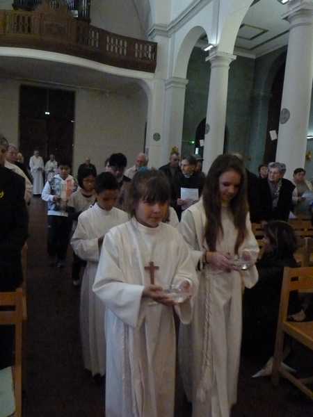 Qui dit rassemblement dominical dit messe et célébration eucharistique. Tous les participants ont quitté la salle de l’Odéon pour gagner l’église Notre-Dame du Val d’Amour de façon à vivre le temps fort d’une foi professée, priée et maintenant célébrée. A l’entrée, chaque paroissien s’était vu remettre une bande de papier crépon bleu. Le baptême était vraiment au centre puisque la cuve baptismale avait été placée entre la nef et le chœur. Durant la célébration, les participants ont été invités à abouter leur ruban de papier à celui de son voisin ; cela a permis de confectionner de très longs rubans qui ont ensuite été amenés jusqu’à la cuve baptismale, signifiant ainsi l’unique source du baptême qui en Jésus-Christ et dans l’Eglise unit tous les chrétiens. Les enfants ont ensuite expliqué à l’assemblée les dessins de leur grande fresque dessinée et coloriée sur le thème de l’eau. Moment de grande ferveur lorsque le Notre Père retentit repris par les enfants entourant les deux prêtres concélébrants, le père Pradelles et le Père Jean Gras et le diacre Michaël Wright. Le chant de l’assemblée était soutenu et embelli par l’accompagnement d’Hélène, notre fidèle organiste.